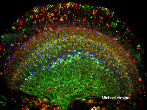 Within the brain, neurons communicate with each other through complex structures called synapses. The formation of numerous synapses between multiple neurons to achieve a specific function leads to the creation of neuronal circuits. This image of a fly eye shows the synapses (blue or red) and neuronal membranes (green) of multiple types of visual neurons. These neurons connect with other neurons of the visual system to form a circuit that relays visual information from the eye into the processing centers of the brain. Visualizing circuits helps us better understand how the nervous system develops and functions.