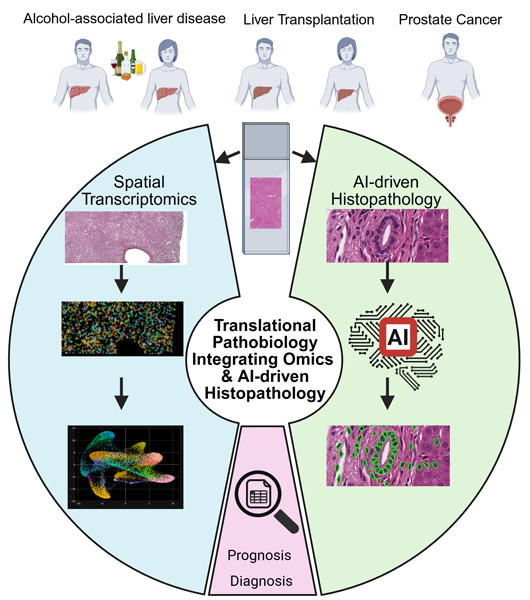 We pursue translational research in end-stage liver disease, liver transplantation, and prostate cancer. A key goal is to uncover disease mechanisms and improve diagnosis, prognosis, and clinical decision-making by translating high-resolution molecular and histopathological data into actionable patient-specific insights. Our interdisciplinary approach integrates spatial transcriptomics, histopathology, AI-based image analysis, and machine learning towards advancing precision medicine. We are pursuing collaborative projects on: