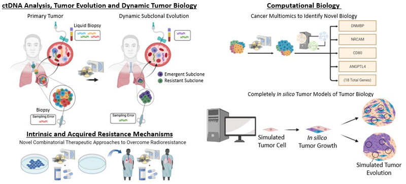 Tumors are functionally complex and heterogeneous entities, and our understanding of cancer biology has expanded to now include tumor evolution as a key driver of tumorigenesis and response to therapy. Specifically, treatments such as radiotherapy impose selection pressure on tumors which can potentiate the expansion of resistant subclones that underpin treatment failures and poor patient outcomes. My laboratory studies this biology using bioinformatic approaches including next-gen sequencing, ctDNA studies, and novel bioinformatic pipelines to conduct studies on patient samples.